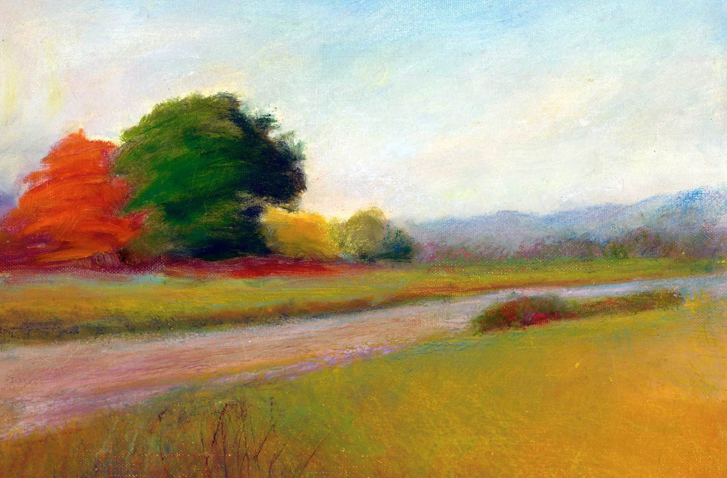 This artwork, titled "Driving Through the Country," captures the essence of a pastoral landscape through its impressionistic style. The scene is marked by soft, blurred brushstrokes that blend colors gently, conveying the motion and tranquility of a countryside journey. A dominant green tree anchors the composition on the left, contrasting with a fiery red tree nearby. The foreground features a field bathed in golden and earthen hues, while the middle distance reveals a hint of a road or path meandering through the terrain. The background is a hazy blend of blues and greens, suggesting distant hills or forests under a muted sky. The overall effect is one of warmth, peacefulness, and the fleeting, ephemeral moments of a drive through rural areas.