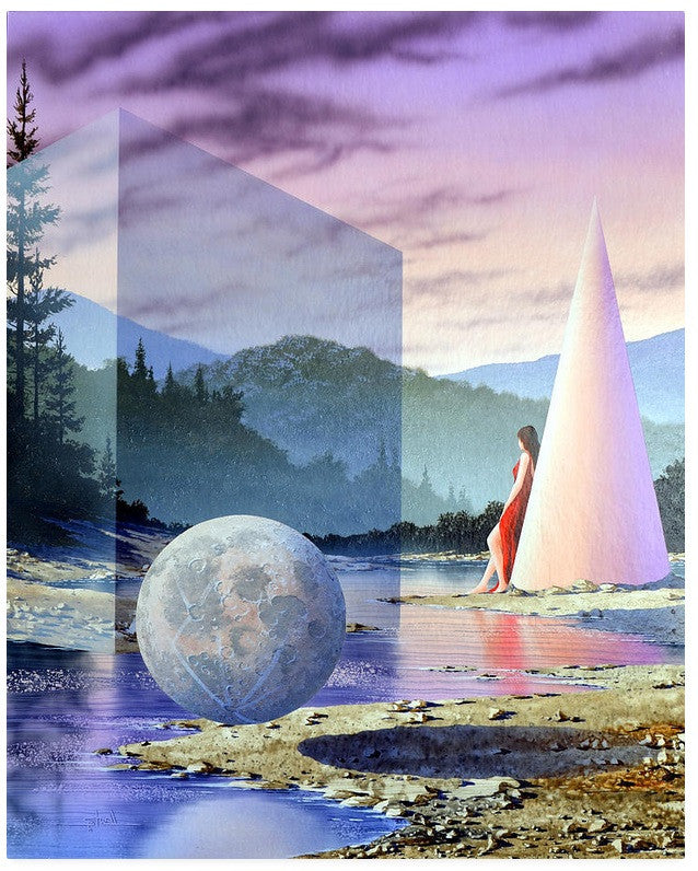 The piece merges elements of reality with fantastical shapes and colors, creating a dreamlike atmosphere that challenges the viewer's perception of space and time.